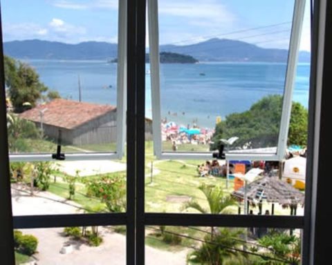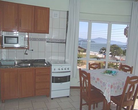Apartamento de 1 dormitório, sala integrada com a cozinha, banheiro social, sacada com churrasqueira, ar condicionado em residencial com internet, tv à cabo, cofre individual, serviço de camareira de frente para o mar.