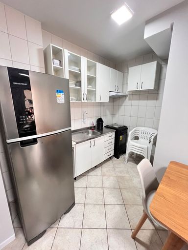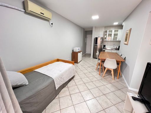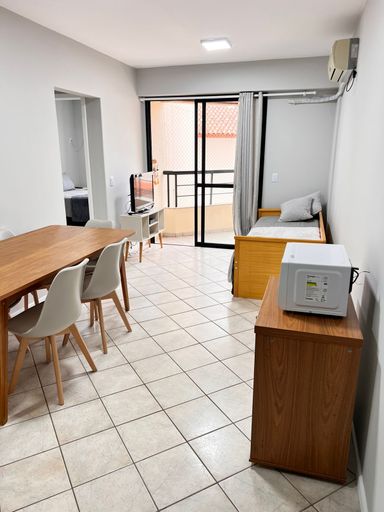Excelente apartamento de 1 dormitório, a 100 metros da praia, sacada com churrasqueira, vaga rotativa e acomodações para até 4 pessoas.